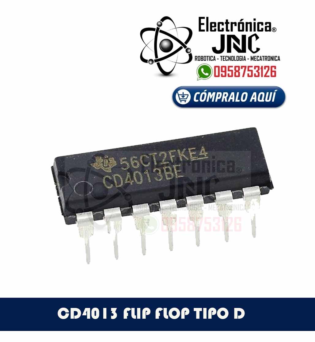El circuito integrado CD4013 contiene en su interior 2 Flip Flop del tipo D. Los cuales cuentan con dos salidas complementarias, es decir una de ellas es contraria con respecto a la otra.